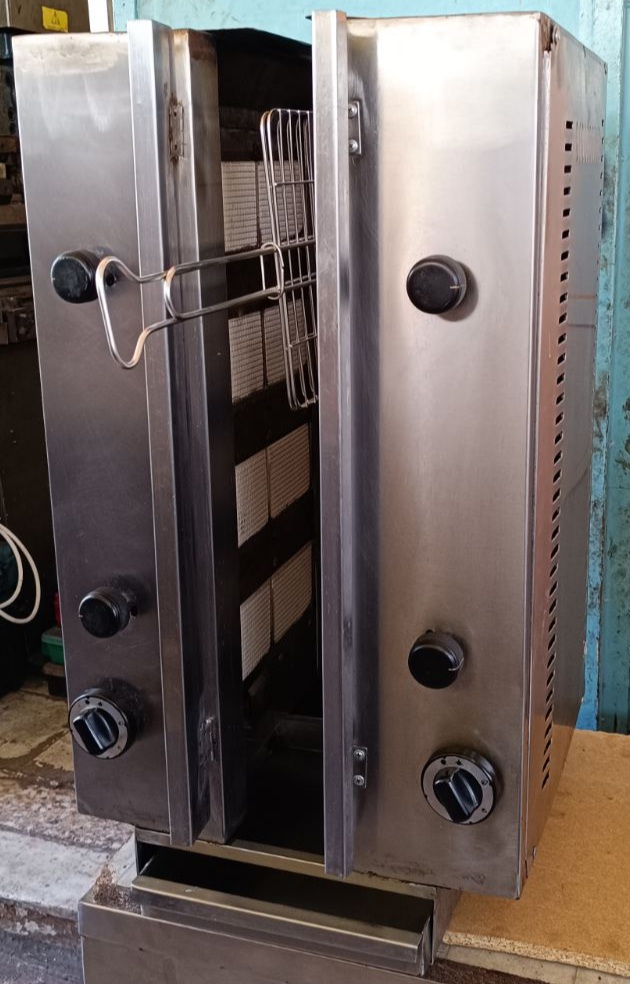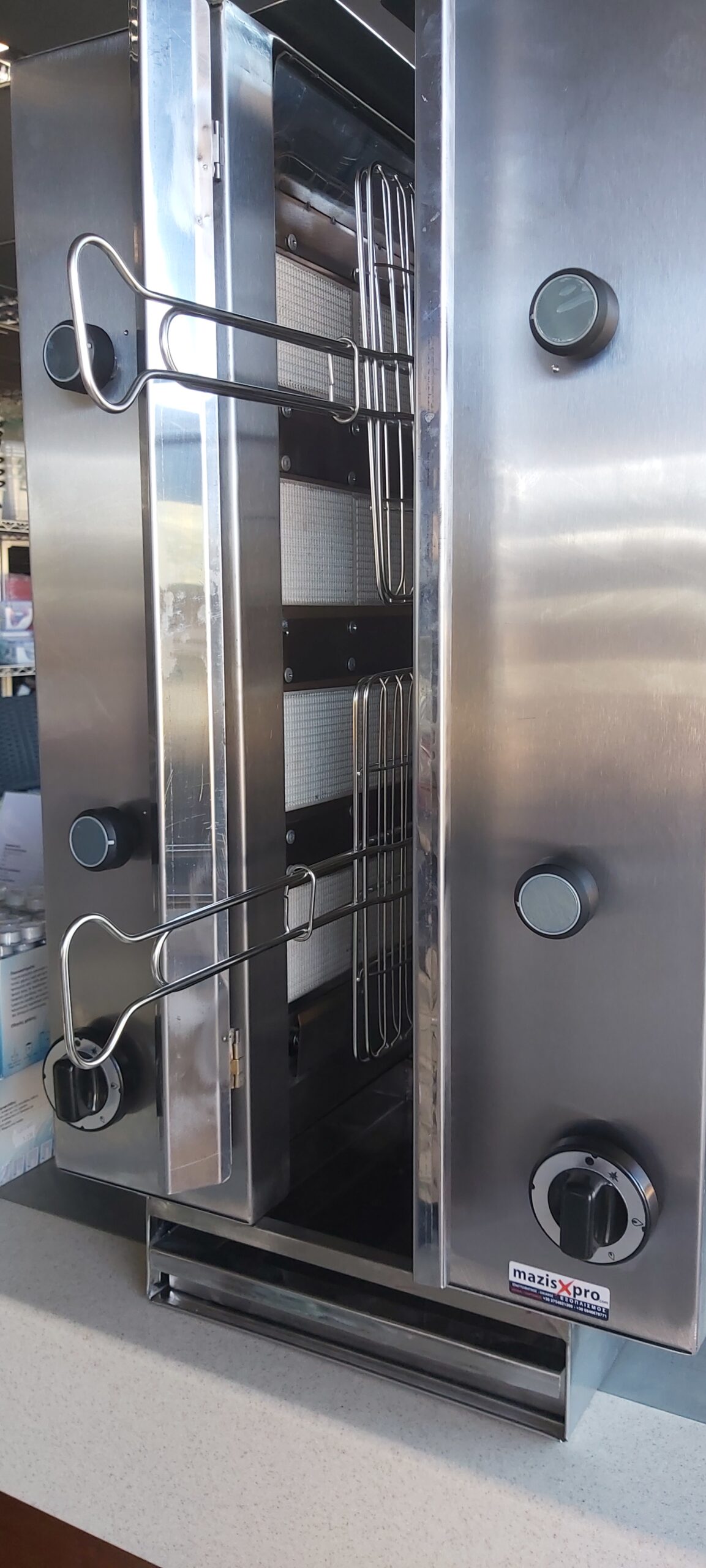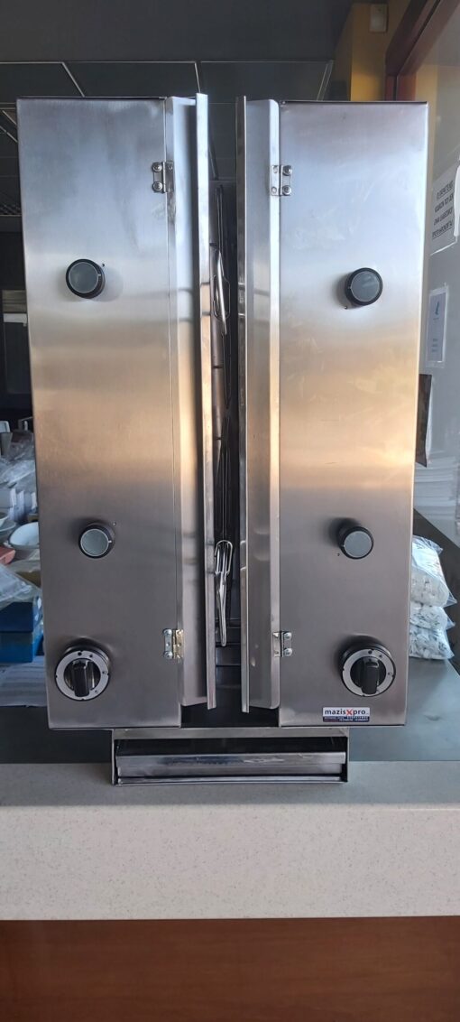 Το μηχάνημα αυτό που είναι εξ ολοκλήρου inox διαθέτει 2+2 καυστήρες με ένα κεντρικό διακόπτη ανά πλευρά θερμοκόπια και πιλότο με συνολικές διαστάσεις 46Χ46Χ83 ύψος